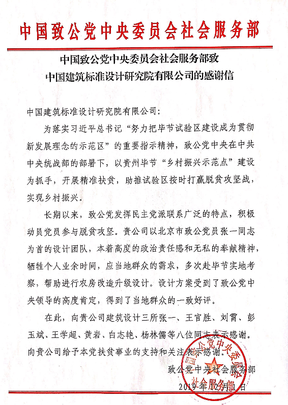 為積極落實中共中央打贏脫貧攻堅戰(zhàn)的號召,標準院自發(fā)參與到貴州省畢節(jié)市七星關(guān)區(qū)的扶貧工作中來。2019年12月1日,在標準院建筑設(shè)計三所項目團隊的共同努力下,標準院收到了中國致公黨中央委員會社會服務(wù)部發(fā)來的感謝信,感謝標準院和項目團隊本著高度的政治責任感和無私的奉獻精神對于扶貧事業(yè)的支持和關(guān)注。