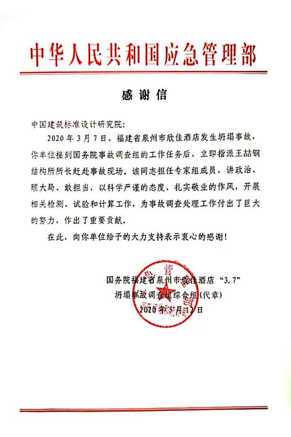 近日,中國(guó)建筑標(biāo)準(zhǔn)設(shè)計(jì)研究院有限公司(以下簡(jiǎn)稱(chēng)“標(biāo)準(zhǔn)院”)收到來(lái)自中華人民共和國(guó)應(yīng)急管理部的感謝信,對(duì)標(biāo)準(zhǔn)院鋼結(jié)構(gòu)專(zhuān)家王喆參加國(guó)務(wù)院福建省泉州市欣佳酒店“3?7”坍塌事故調(diào)查工作表示感謝。