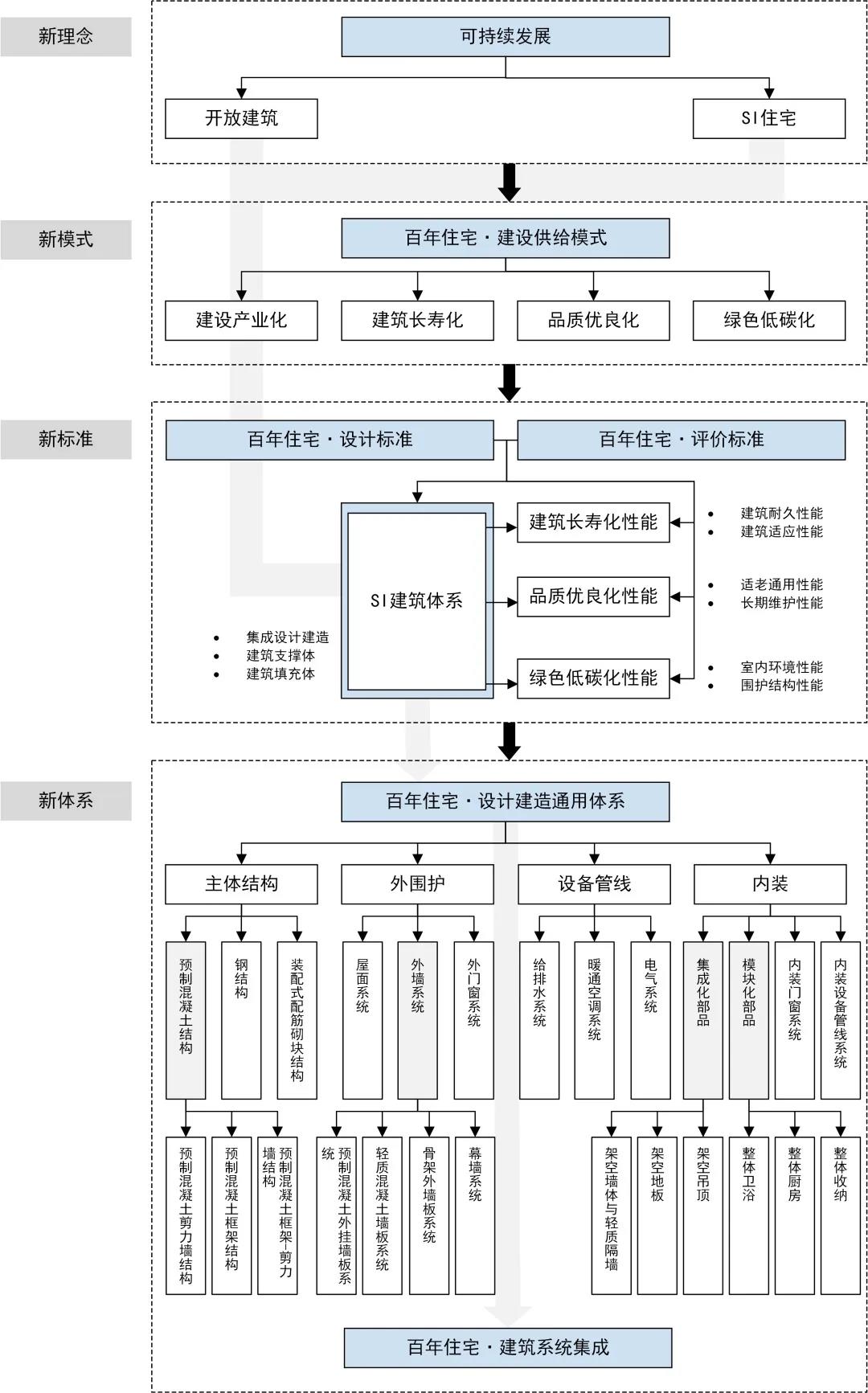 百年住宅正是基于國際視角的開放建筑和SI 住宅綠色可持續(xù)建設(shè)理念與方法,聚焦結(jié)合我國建設(shè)發(fā)展現(xiàn)狀和住宅建設(shè)供給方式,探索提出的一種面向未來的新型住宅建設(shè)模式與產(chǎn)品供給。以可持續(xù)居住環(huán)境建設(shè)理念為基礎(chǔ),通過建設(shè)產(chǎn)業(yè)化,實現(xiàn)建筑的長壽化、品質(zhì)優(yōu)良化、綠色低碳化,建設(shè)更具長久價值的人居環(huán)境[8]。