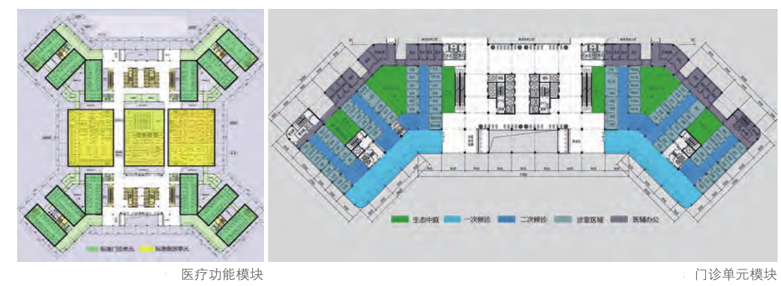為了實(shí)現(xiàn)“會(huì)生長(zhǎng)的醫(yī)院”,我們將“模塊化”的概念引入,設(shè)置了標(biāo)準(zhǔn)的門診單元及醫(yī)技單元。病房樓下側(cè)依次展開門診單元(每個(gè)單元的尺寸控制在12.4~29m),每層南北各設(shè)置6個(gè)模塊。模塊間設(shè)置景觀庭院及交通核,充分引入自然采光和通風(fēng);醫(yī)技模塊設(shè)置在中間位置。門診、醫(yī)技模塊之間通過連廊連接,聯(lián)系緊密。模塊化的設(shè)計(jì)增強(qiáng)了功能的替代性,能夠適應(yīng)科室的多元發(fā)展;模數(shù)化的柱網(wǎng)也增強(qiáng)了建筑的穩(wěn)定性與經(jīng)濟(jì)性。