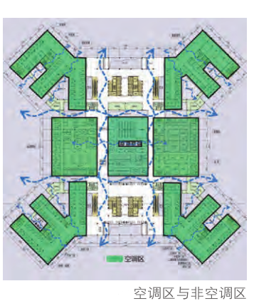 為了提升建筑通風(fēng)、隔熱的效果,建筑體量輕薄、通透,并結(jié)合當(dāng)?shù)貧夂蛱卣?、空間使用特點(diǎn)以及節(jié)約投資的考慮,在建筑主體內(nèi)部劃分空調(diào)區(qū)與非空調(diào)區(qū)。非空調(diào)區(qū)直接與室外相連,保證建筑主體空氣的自然流通。