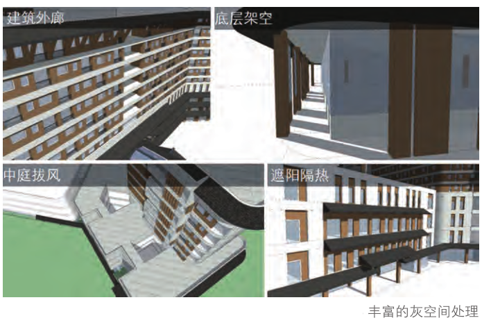 建筑設(shè)置了大量的半室外灰空間。通過設(shè)置外廊、底層架空、中庭拔風(fēng)、立體綠化、遮陽(yáng)隔熱構(gòu)件等處理,營(yíng)造了涼爽舒適的微環(huán)境,同時(shí)也增強(qiáng)了建筑的立面層次。