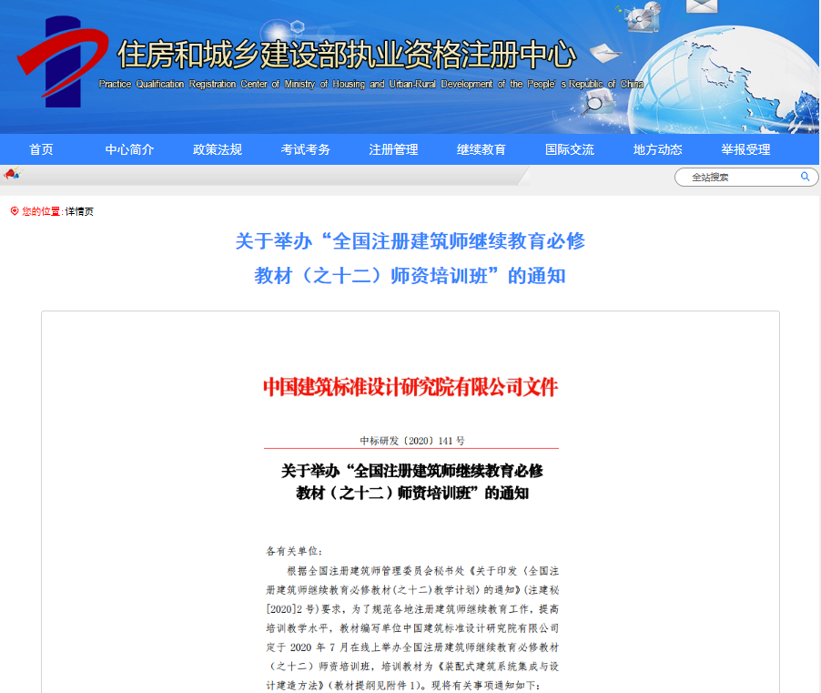 根據(jù)全國注冊建筑師管理委員會秘書處《關于印發(fā)〈全國注冊建筑師繼續(xù)教育必修教材(之十二)教學計劃〉的通知》(注建秘[2020]2號)要求,為了規(guī)范各地注冊建筑師繼續(xù)教育工作,提高培訓教學水平,教材編寫單位中國建筑標準設計研究院有限公司定于2020年7月在線上舉辦全國注冊建筑師繼續(xù)教育必修教材(之十二)師資培訓班(中標研發(fā)[2020]141號),培訓教材為《裝配式建筑系統(tǒng)集成與設計建造法》。師資培訓采取教材作者授課、咨詢答疑、研討交流等方式進行。