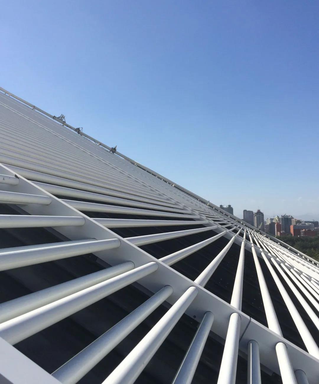 屋面體系為直立鎖邊+金屬鋼管組成的幕墻體系,利用周全排水溝及層層退臺的單獨排水有效的解決了排水及防雪墜落等問題。