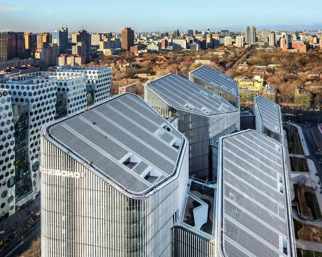 SOHO五棟建筑幕墻轉(zhuǎn)角流線一直延續(xù)到傾斜的屋面處,傾斜屋面的設(shè)計旨在避免遮擋北面住宅區(qū),在遵守當?shù)厝照諛藴实耐瑫r也成就了獨特的造型語言。屋面形成建筑“第五立面”,凹進的平臺和日光中庭點綴其間。