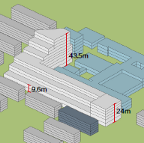 若新建大樓采用南北向布局,建筑高度和平面尺度會(huì)受到北側(cè)和東側(cè)已有住宅日照條件的制約。為實(shí)現(xiàn)適宜的規(guī)模和完整體量,減少對(duì)東、北側(cè)的住宅區(qū)的日照影響,設(shè)計(jì)最終選擇了東西向高層的建筑布局。