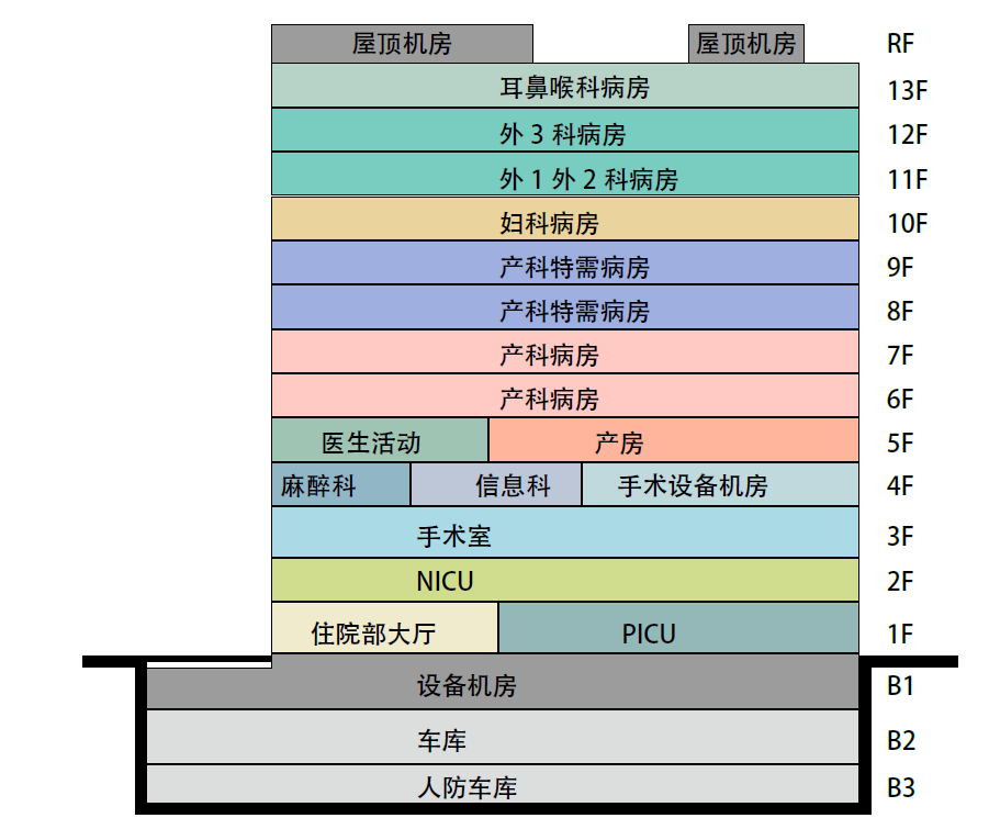 本項(xiàng)目屬于彩虹醫(yī)院改擴(kuò)建項(xiàng)目一期工程,為醫(yī)技住院樓。功能涵蓋住院大廳、手術(shù)室、PICU、新生兒科(含NICU)、產(chǎn)房;產(chǎn)科、婦科、外科、耳鼻喉科的住院部;以及設(shè)備機(jī)房、地下車(chē)庫(kù)等多種功能。