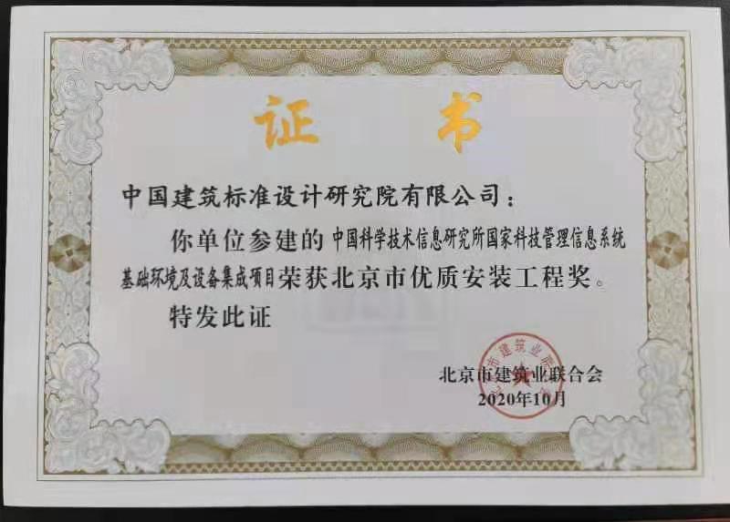 近日,由中國(guó)建筑標(biāo)準(zhǔn)設(shè)計(jì)研究院(以下簡(jiǎn)稱“標(biāo)準(zhǔn)院”)參建的中國(guó)科學(xué)技術(shù)信息研究所國(guó)家科技管理系統(tǒng)基礎(chǔ)環(huán)境及設(shè)備集成項(xiàng)目,榮獲“北京市優(yōu)質(zhì)安裝工程獎(jiǎng)”。