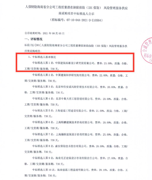 2021年8月5日,人保財險海南省分公司IDI保險的風險管理服務(wù)商采購項目中標候選人結(jié)果正式公布,標準院建筑產(chǎn)品應(yīng)用技術(shù)研究院在該采購項目所有中標候選人中名列第一名!