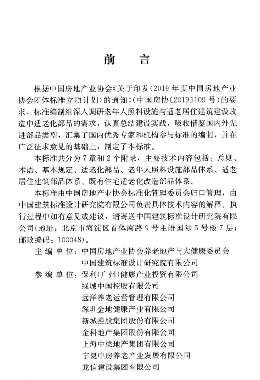 為積極應(yīng)對人口老齡化,建立健全與十四五規(guī)劃和2035年遠(yuǎn)景目標(biāo)綱要提出的“支撐家庭承擔(dān)養(yǎng)老功能,構(gòu)建居家社區(qū)機(jī)構(gòu)相協(xié)調(diào)、醫(yī)養(yǎng)康養(yǎng)相結(jié)合的養(yǎng)老服務(wù)體系”相適應(yīng)的適老部品體系,針對當(dāng)前適老部品體系缺失,適老部品質(zhì)量參差不齊,智能化、精細(xì)化程度不夠等實際問題,由中國建筑標(biāo)準(zhǔn)設(shè)計研究院有限公司劉東衛(wèi)總建筑師牽頭,聯(lián)合中國房地產(chǎn)業(yè)協(xié)會、保利、綠城、遠(yuǎn)洋、金地、新城、金科、中梁、寧夏中房、龍信、德源、陽光城等企業(yè),在廣泛項目調(diào)研和成功實踐的基礎(chǔ)上,共同編制了《老年人照料設(shè)施與適老居住建筑部品體系標(biāo)準(zhǔn)》(以下簡稱“《標(biāo)準(zhǔn)》”),并于2021年9月1日發(fā)布實施。