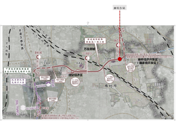 京廊城際產(chǎn)業(yè)園項目分為北區(qū)、南區(qū)兩個標(biāo)段,圍繞廊坊東站車站建設(shè)。其位于河北省廊坊市境內(nèi),緊鄰新建城際鐵路聯(lián)絡(luò)線一期工程的廊坊東站車站。高鐵線一期工程線路總長39.7km,共設(shè)4座車站,分別為廊坊東站、空港新區(qū)站、新航城站、新機場站。未來二期工程進一步延伸至首都機場T3航站樓。
