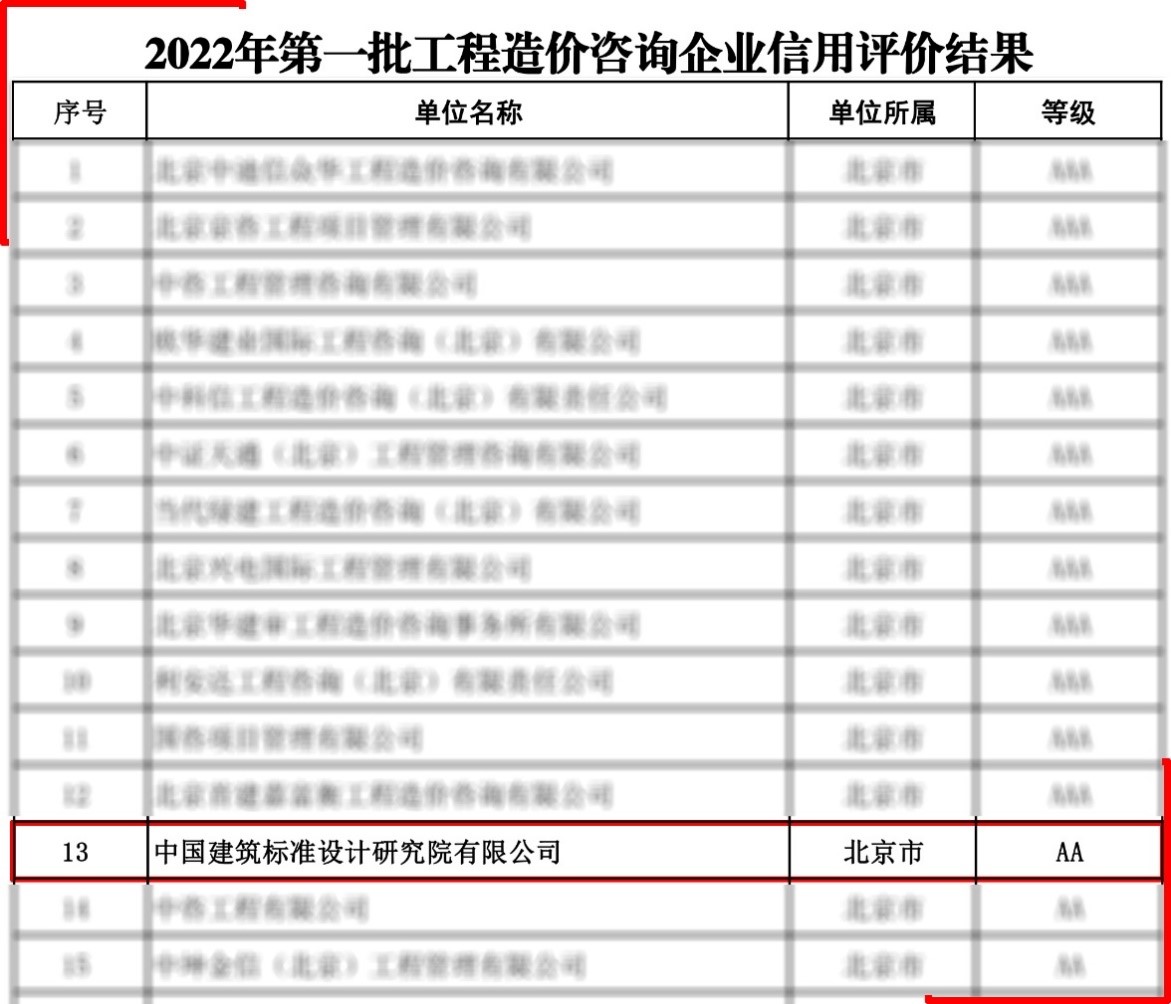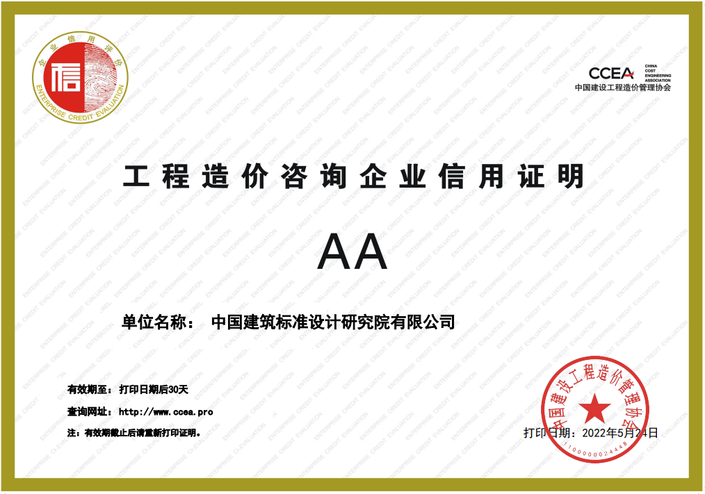 日前,中國建筑標(biāo)準(zhǔn)設(shè)計(jì)研究院有限公司(以下簡稱“標(biāo)準(zhǔn)院”)獲評中國建設(shè)工程造價管理協(xié)會AA級造價咨詢企業(yè)信用等級。