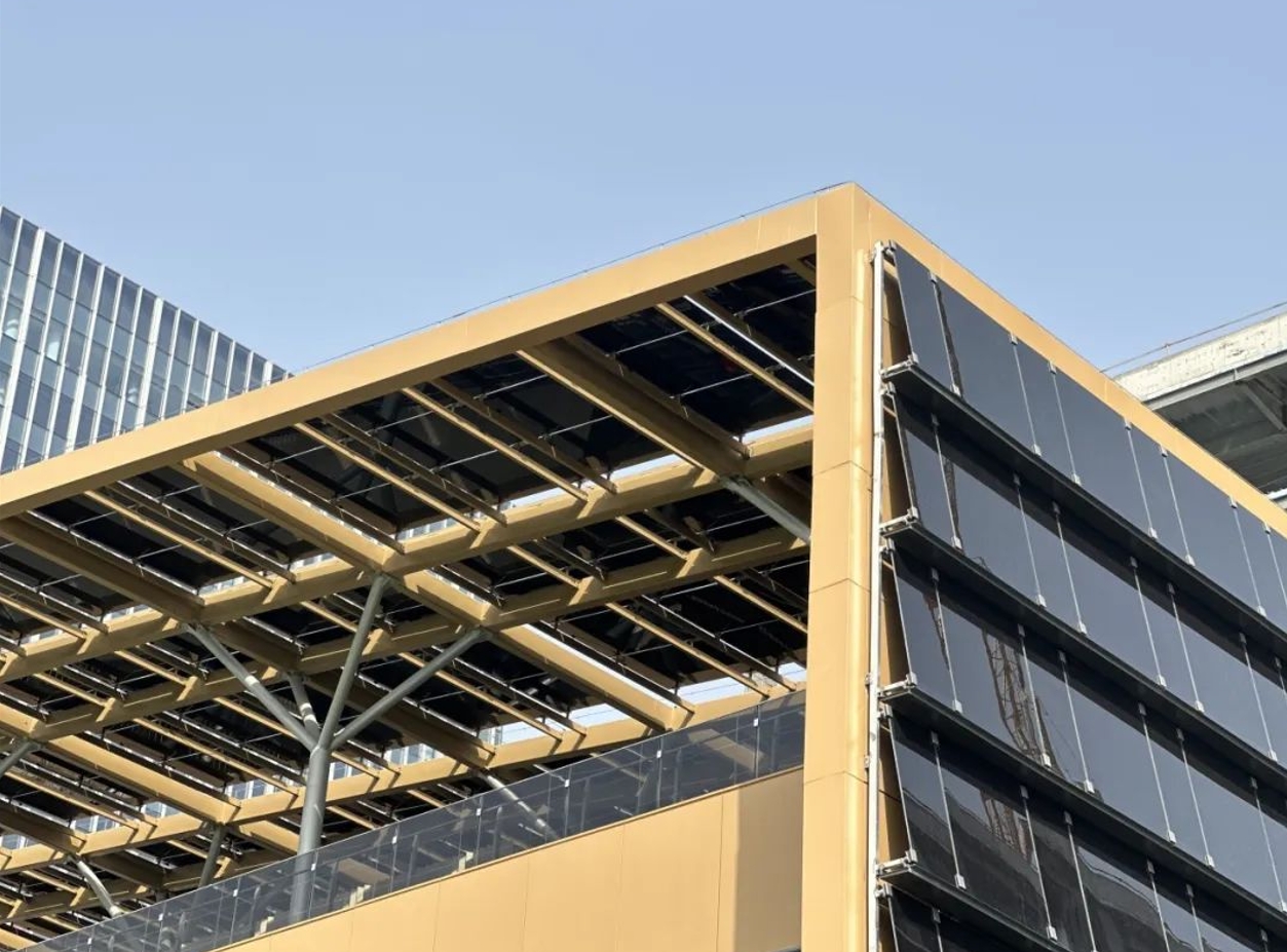 首程時(shí)代中心負(fù)碳示范樓位于用地西北角,建筑高度19.3米,光伏屋架最高點(diǎn)23.9米,地上3層,地下2層(帶夾層),被動(dòng)區(qū)總面積3186.9㎡,其中地上建筑面積2441.07㎡、地下745.83㎡(含樓梯間、前室、部分機(jī)房等)。示范樓首層為低碳、零碳技術(shù)及產(chǎn)品展廳(層高5.7米),二、三層為多功能活動(dòng)、接待及辦公功能(層高4.2米)。地上采用裝配式鋼框架結(jié)構(gòu),外立面采用BIPV光伏一體化幕墻體系,同時(shí)在建筑頂部屋架布置太陽(yáng)能光伏玻璃,將太陽(yáng)能發(fā)電產(chǎn)品有機(jī)地融入到建筑外表皮中,實(shí)現(xiàn)了整體光伏建筑設(shè)施一體化。