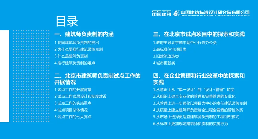 其次韓高峰總經(jīng)理展示了近年來標(biāo)準(zhǔn)院和兄弟院承接的12個(gè)建筑師負(fù)責(zé)制試點(diǎn)項(xiàng)目,分享了項(xiàng)目實(shí)施中的寶貴經(jīng)驗(yàn),并總結(jié)了北京市建筑師負(fù)責(zé)制推行中的工作重點(diǎn)和工作亮點(diǎn)。