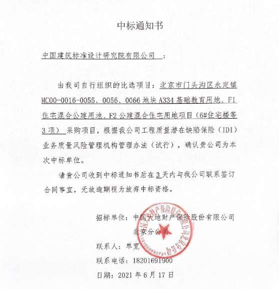 2021年6月17日,中國大地財產(chǎn)保險股份有限公司北京分公司的風(fēng)險管理服務(wù)商中標結(jié)果正式公布,標準院建筑產(chǎn)品應(yīng)用技術(shù)研究院成功中標“北京市門頭溝區(qū)永定鎮(zhèn)MC00-0016-0055、0056、0066地塊A3 ...